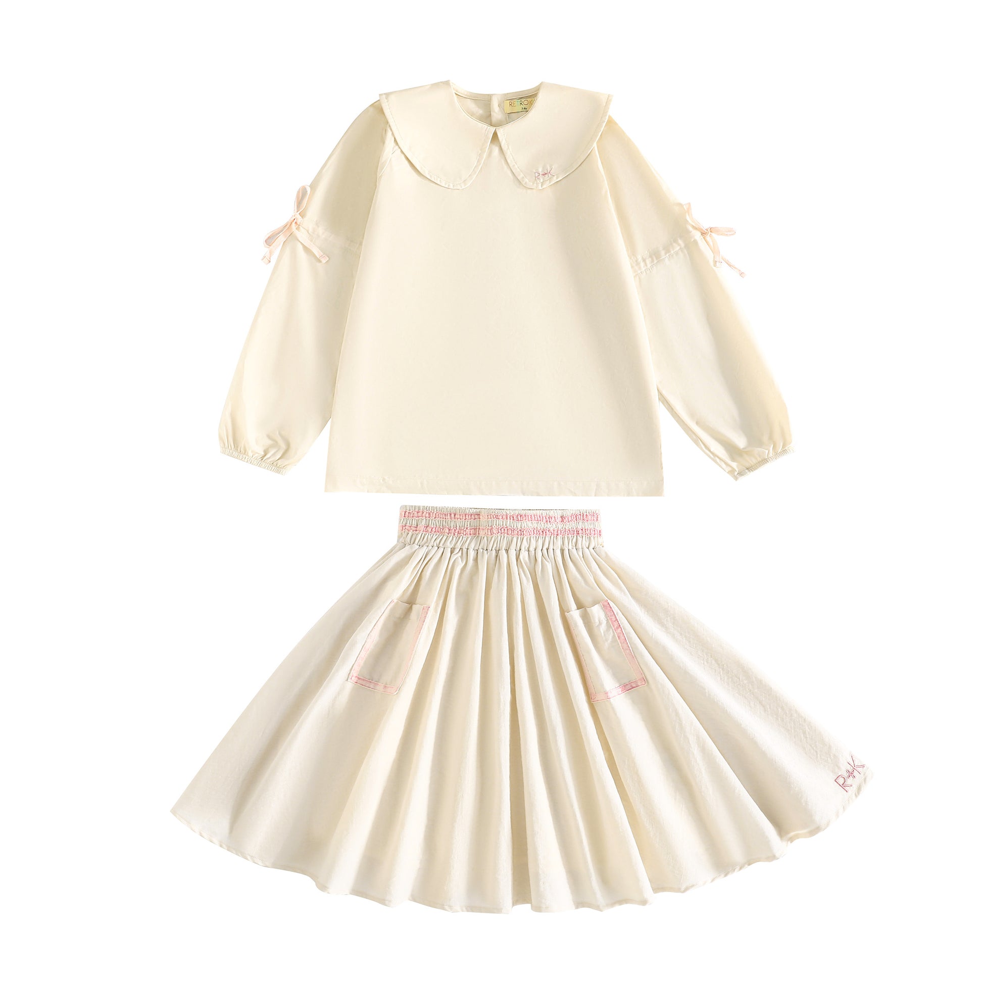 RetroKid Halston Gathered Ribbon Sleeve Collar Blouse & Smocked Skirt Set